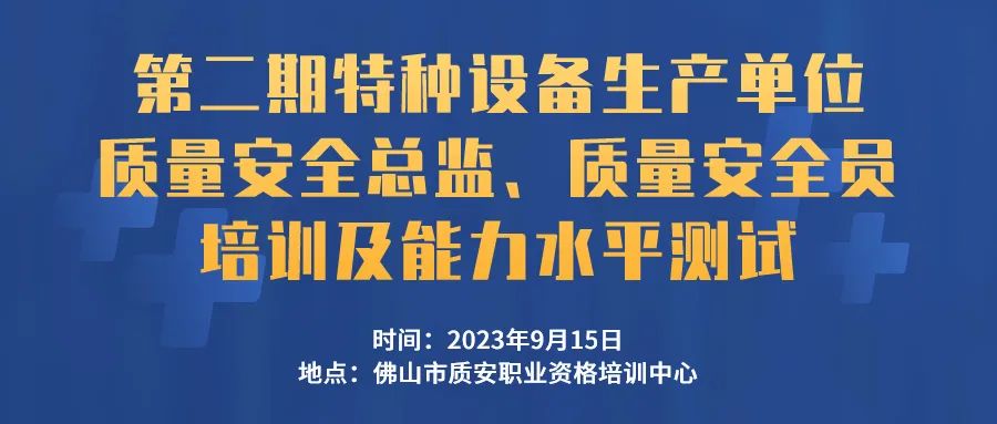 @各特种设备生产单位及相关人员,为进一步加强特种设备安全工作,帮助特种设备生产单位贯彻落实《特种设备生产单位落实质量安全主体责任监督管理规定》(市场监管总局令第73号),提升企业安全管理水平,助力企业配置质量安全总监、质量安全员,广东省特种设备行业协会将于2023年9月15日举办第二期特种设备生产单位质量安全总监、质量安全员培训及能力水平测试。
