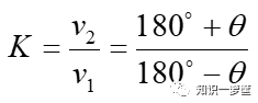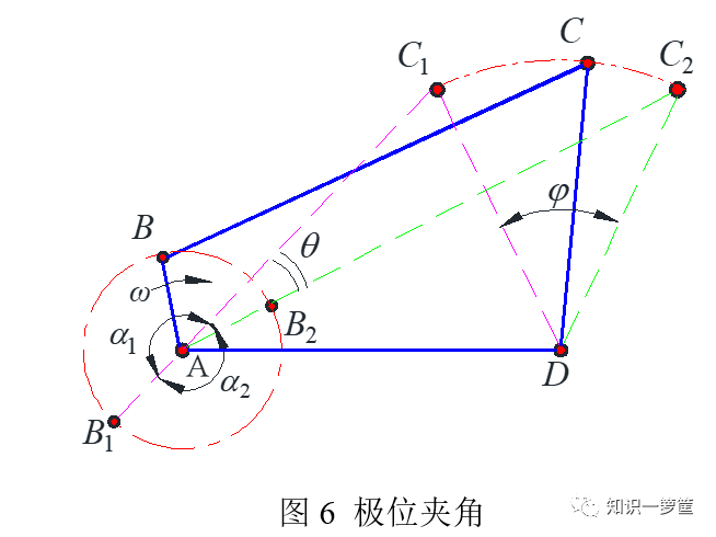 怎么表示急回特性呢?可以用极位夹角与行程速比系数来描述。极位夹角是指摇杆处于两个极限位置时,这时连杆与曲柄共线,连杆两个位置之间的夹角,如图6所示的θ。而行程速比系数,是回程速度与工作行程速度之比,用公式表示为: