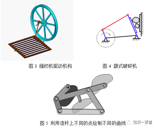 你看我的运动,“让我们一起摇摆”!姿势这么“风骚”、转的这么“花里胡哨”,到底有什么用呢?你可不要低估了我的作用,我在各类机械中可是最基础的存在,我是将连续的转动转换为往复的摆动,如图2中的天线调节机构。当然也可以反过来,将往复的摆动转换为整周的连续转动,例如缝纫机的脚踏驱动机构就是将往复的摆动转换为带轮的连续的转动,如图3所示。我有时力大无穷,可以将矿石破碎,如图4的额式破碎机。我有时很臭美,利用我连杆上不同点绘制美丽的曲线,如图5所示。