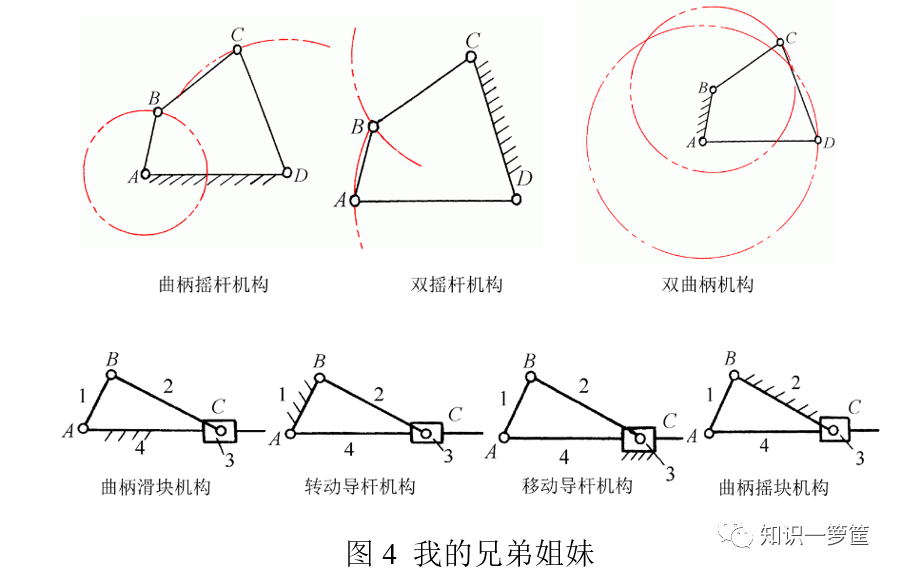 我还有很多变型,最常用的变身法术是:1)选用不同的构件做机架;2)转动副转化为移动副;3)扩大运动副。例如,选我的最短杆(曲柄)作为机架,就变成了双曲柄机构(图4上右);选我最短杆的对边杆作为机架,我就变成了双摇杆机构(图4上中)。将C点转动副演变成移动副,我就会变成曲柄滑块机构(图4下左)。