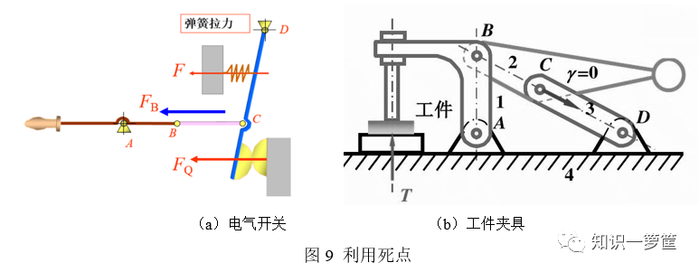 当然,有些人有时候就是不想让我好过,让我在卡bug中沉默。当需要利用死点时,我就让机构工作在死点位置,可以夹紧工件、保障支撑工作可靠等,如图9所示。这种方式在机械加工中的机械卡具的设计中经常用到。我恨夹具!