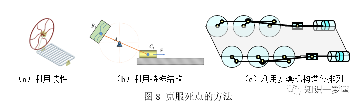 对于死点,我有时想办法克服,有时利用它做一些事情。当需要避免死点时,我会在输出曲柄上安装飞轮(如内燃机安装的飞轮),借助飞轮的惯性,使机构闯过死点;或者借助特别的结构避免死点;或者采用多个相同机构驱动同一个曲柄,这些多套机构的相位相互错开,从而使各机构的死点位置不同以度过死点,分别如图8所示。(这是不是和三相电的原理有点相似呢?)