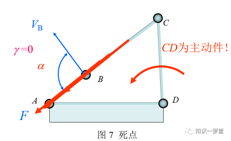 。我也有“死点”,也是我爱卡bug的地方。当摇杆为主动件时,在曲柄与连杆共线的位置,无论在摇杆上施加多大的力,我都不能运动,这个位置是我的死点位置,如图7所示。说白了,就是曲柄和连杆到了一条直线,我们“对着干开了”或者“反向拉锯了”,我就会卡bug。