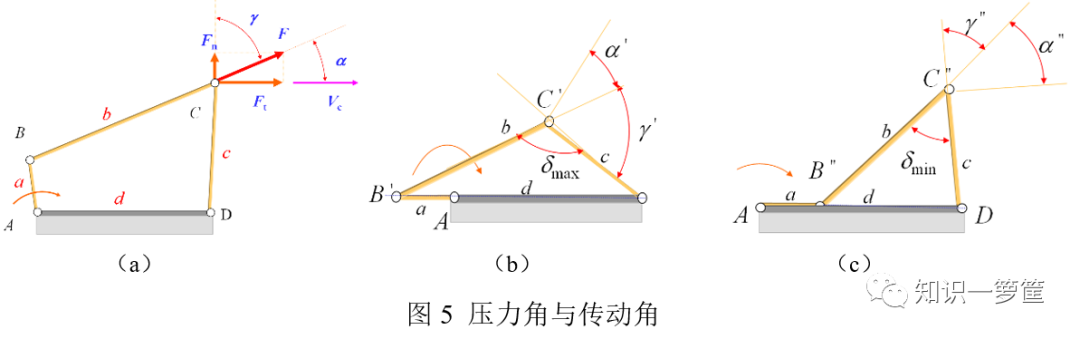 我的使命就是“四两拨千斤”,尽可能提高传力效果。对,用压力角来衡量传力效果。请看图5a,从动件C点的受力与运动方向的夹角是压力角。由于压力角不好直接测量,也可以用与压力角互余的传动角来衡量传力效果。传动角就是杆BC(连杆)和杆CD(摇杆)所夹的角。工程实践中,传动角越大越好,我一般希望最小传动角大于40-50°。最小传动角如何得到呢?看看图5b和5c,曲柄与机架两次共线位置,连杆与摇杆之间夹角的最小值为最小传动角。