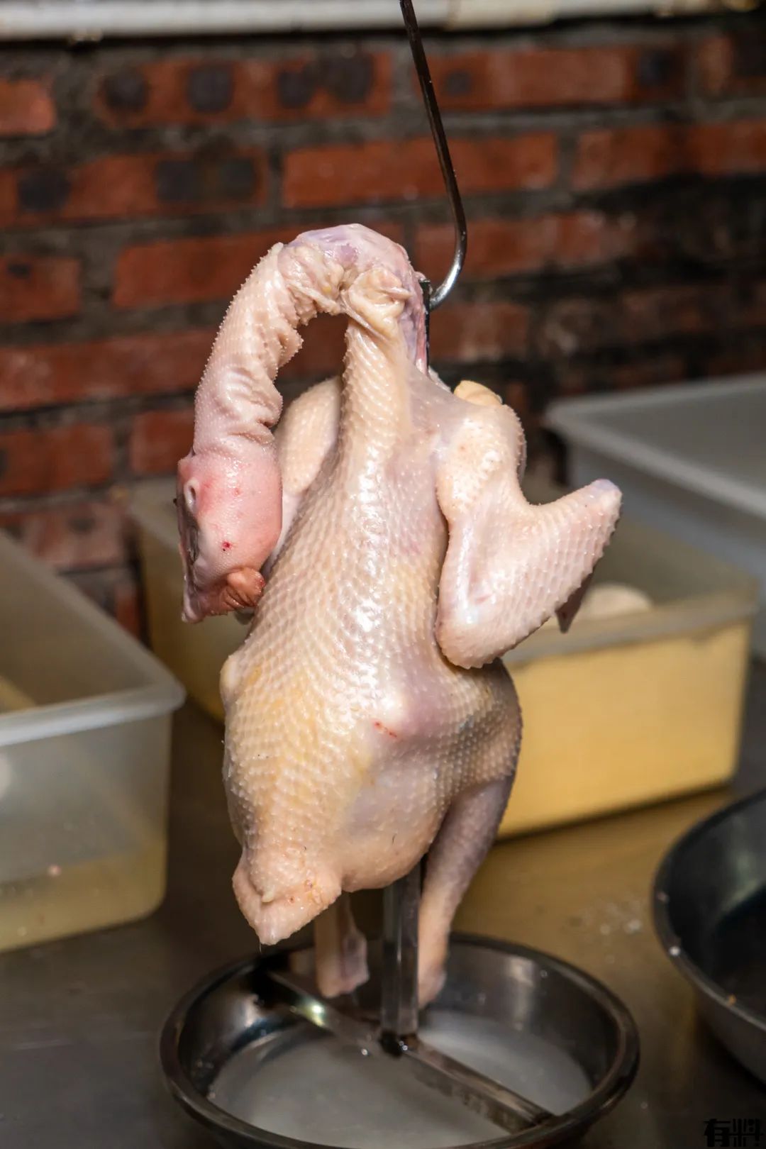 每天现宰的鸡上桌前要经过各种工序,先要将表皮晾干,再抹上食用盐,最后挂起啦就可以送入烤炉,每个步骤缺一不可。