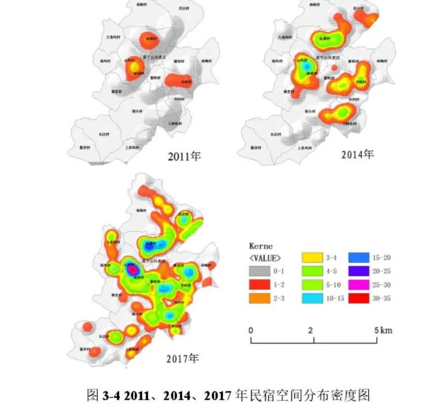 直到2017年,民宿整体平均最近邻距离由2011年的627.89米减少到85.76米,环莫干山民宿的集聚程度由集聚到强烈集聚,集聚程度呈现出急速提升的特征。