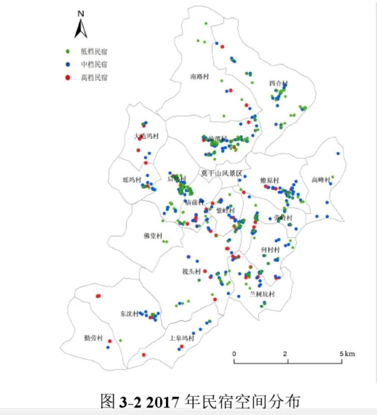 这时候,民宿出现空间扩散现象,民宿在各行政村均有分布,其中毗邻莫干山风景区的仙潭、燎原、劳岭、紫岭、庙前和后坞村数量较多,分布更为集中,形成以后坞村为一级核心,仙潭、劳岭、兰树坑为二级核心的四处小规模民宿集聚区。