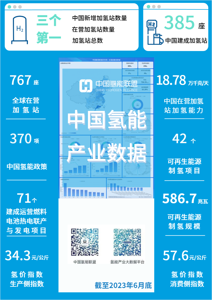 根据中国氢能联盟氢能产业大数据平台【氢界】数据显示,截止6月底,我国各地方共发布氢能政策370项,累计建成运营可再生能源制氢项目42个,累计建成运营燃料电池热电联产与发电项目71个,累计建成并运营加氢站数量达到了385座,新增加氢站数量、在营加氢站数量以及加氢站总数这三项指标均位居全球首位。