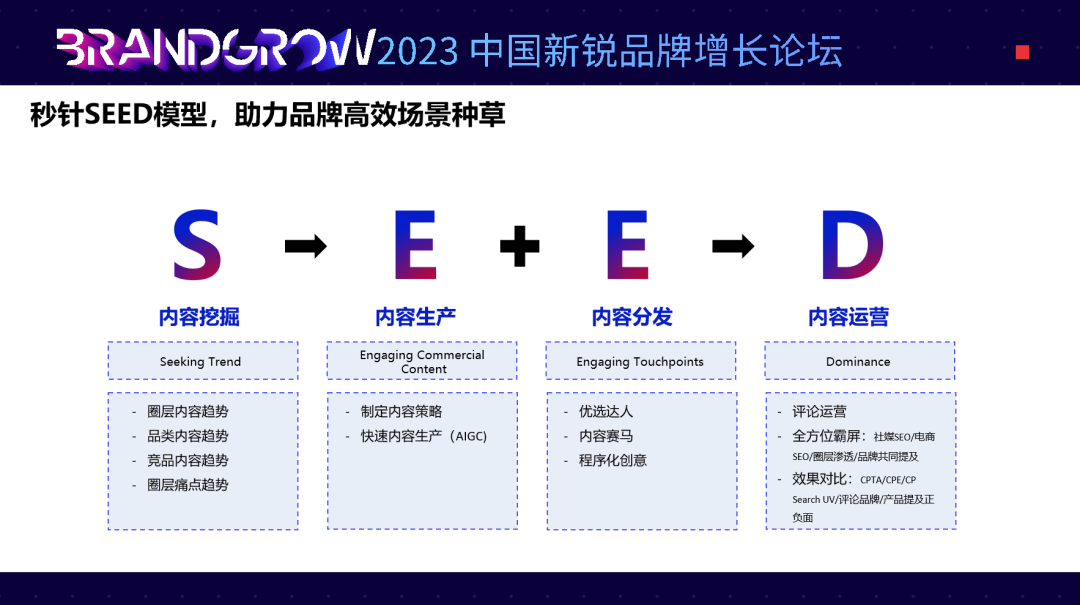 五感更好地承接了当下的时代情绪,更容易让品牌和消费者产生共情。比如,今年的流行的特种兵打卡、职场发疯文学等就是疫后释放感的体现。五感与品牌营销场景的融合,则可遵循秒针系统最新推出的“SEED”(种草)模型,S(Seeking Trend,内容挖掘)、E(Engaging Commercial Content,内容生产)E(Engaging Touchpoints,内容分发)、D(Dominance,内容运营)。