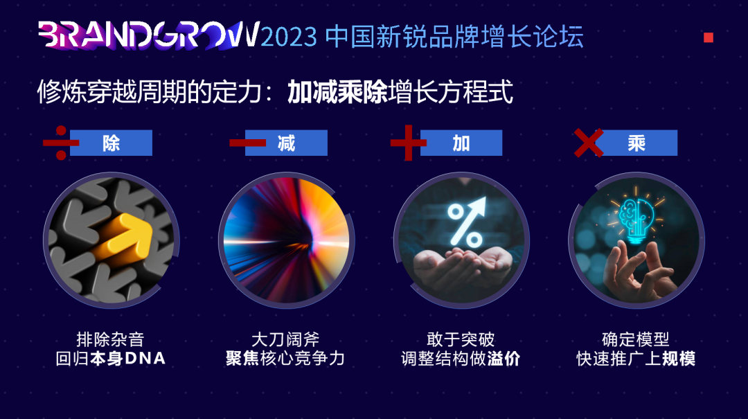 贝恩咨询全球专家合伙人、混沌教练鲁秀琼围绕主题“穿越周期的定力”发表演讲,分享了许多前沿洞察。基于多年在全球快消品行业及营销领域的丰富经验,结合今年针对新锐品牌发展的观察,她将新锐品牌修炼穿越周期的定力的过程形象地总结为“打造加减乘除的增长方程式”。