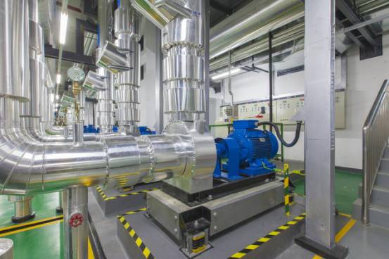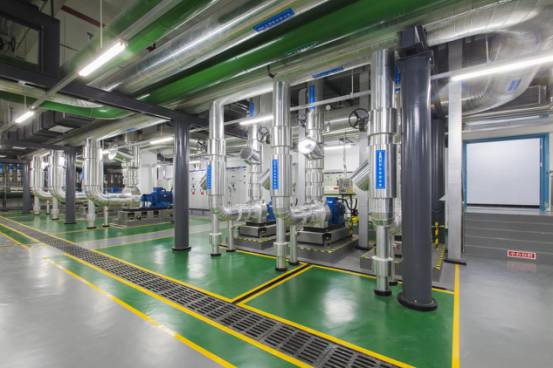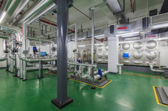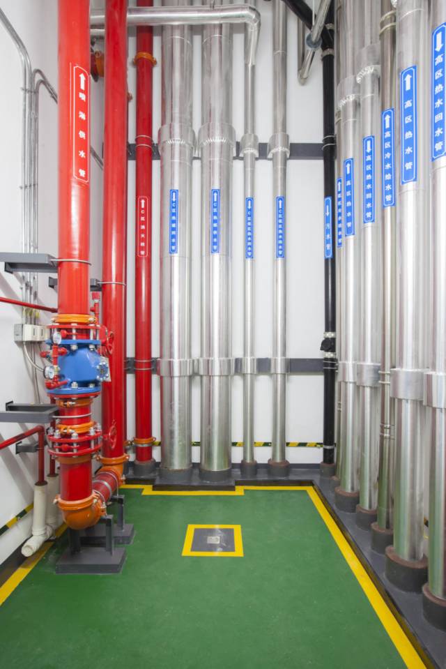 空调换热机房布局合理,设备运行可靠,支架安全、可靠、大气,标识清晰