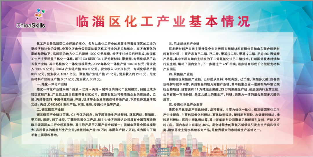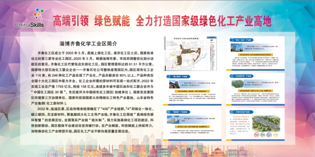国赛期间,政府组织淄博齐鲁化学工业区、山东兴鲁化工股份有限公司、山东凯威尔新材料有限公司、淄博正华助剂股份有限公司、淄博圣炼化工有限责任公司、淄博诺奥化工有限公司、华谊合丰特种化学淄博有限公司等20余家临淄区化工头部企业、工业园区走进淄博市工业学校参加临淄区化工企业展示会。