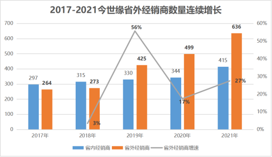 数据显示,2021年今世缘省内经销商415个,省外经销商数量636个,远超省内。省内继续提升份额的同时,省外开始大幅发力,让公司成长确定性不断增强。