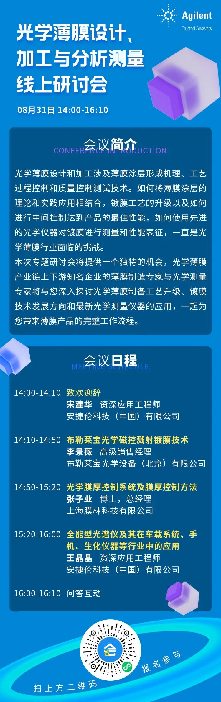 8月31日下午,光学薄膜设计、加工与分析测量线上研讨会即将举办。本次线上研讨会将提供一个独特的机会,光学薄膜产业链上下游知名企业的薄膜制造专家与光学测量专家将与您深入探讨光学薄膜制备工艺升级、镀膜技术发展方向和最新光学测量仪器的应用,一起为您带来薄膜产品的完整工作流程。