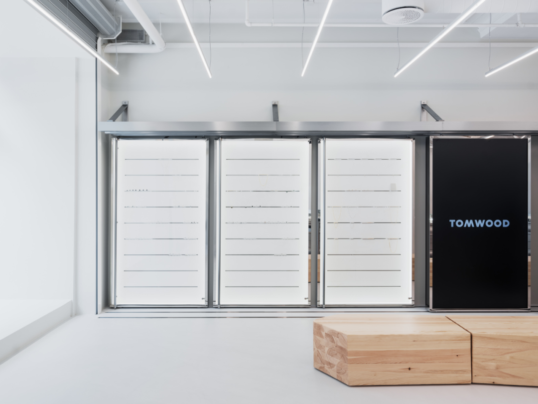 Tom Wood旗舰店的天花板裸露着,粉刷过的墙面展示着简洁的美感。线性灯悬挂其中,从光学上扩大了空间的感觉。对面是柔性墙,由可移动的橱柜、镜子和大屏幕组成,可以根据需要进行多种配置。在这个简约而舒适的环境中,家具艺术家Niklas Runesson手工雕刻的大木凳为顾客提供了休憩的地方,同时也凸显了Tom Wood品牌对自然的尊重和灵感来源。