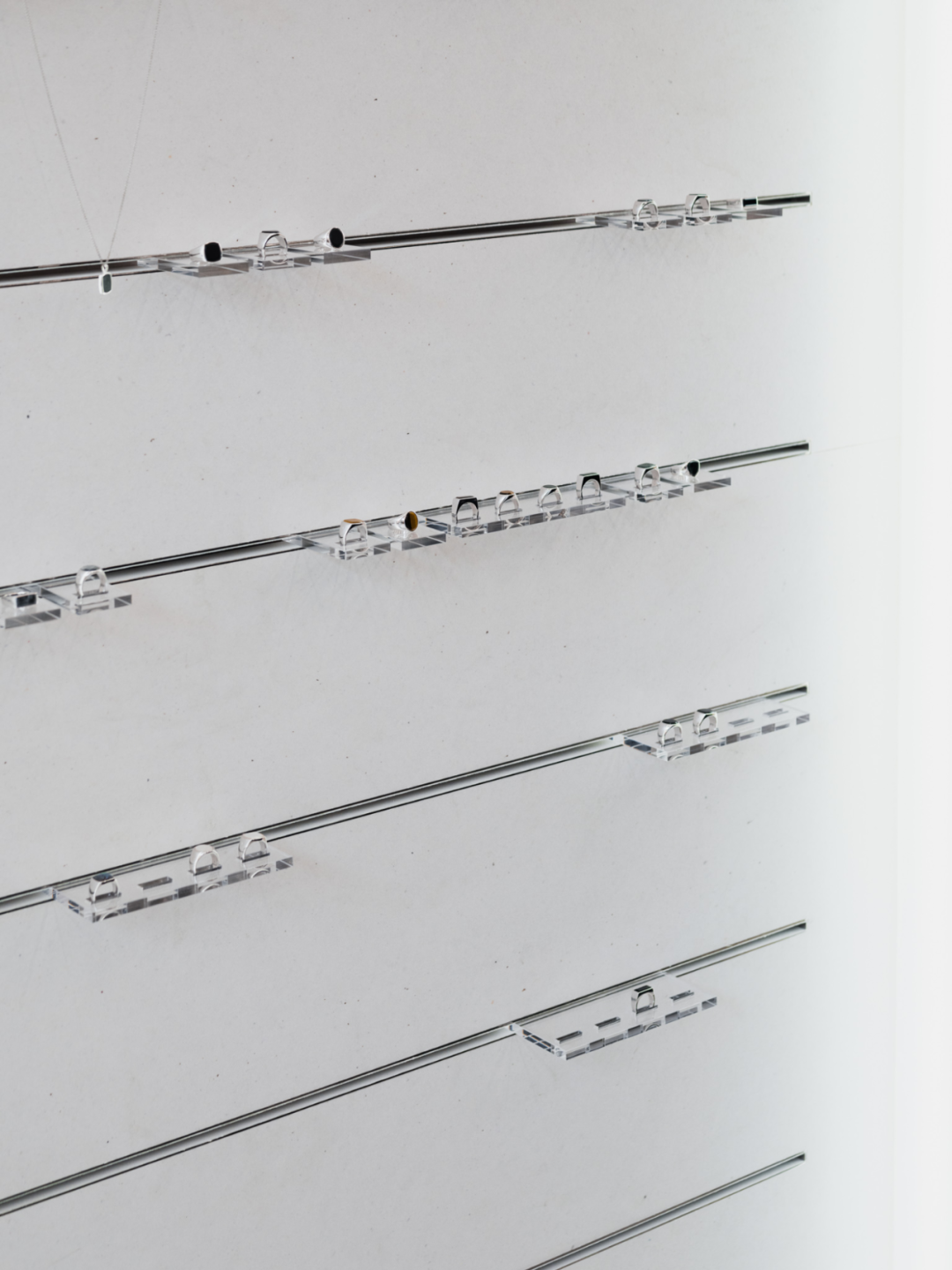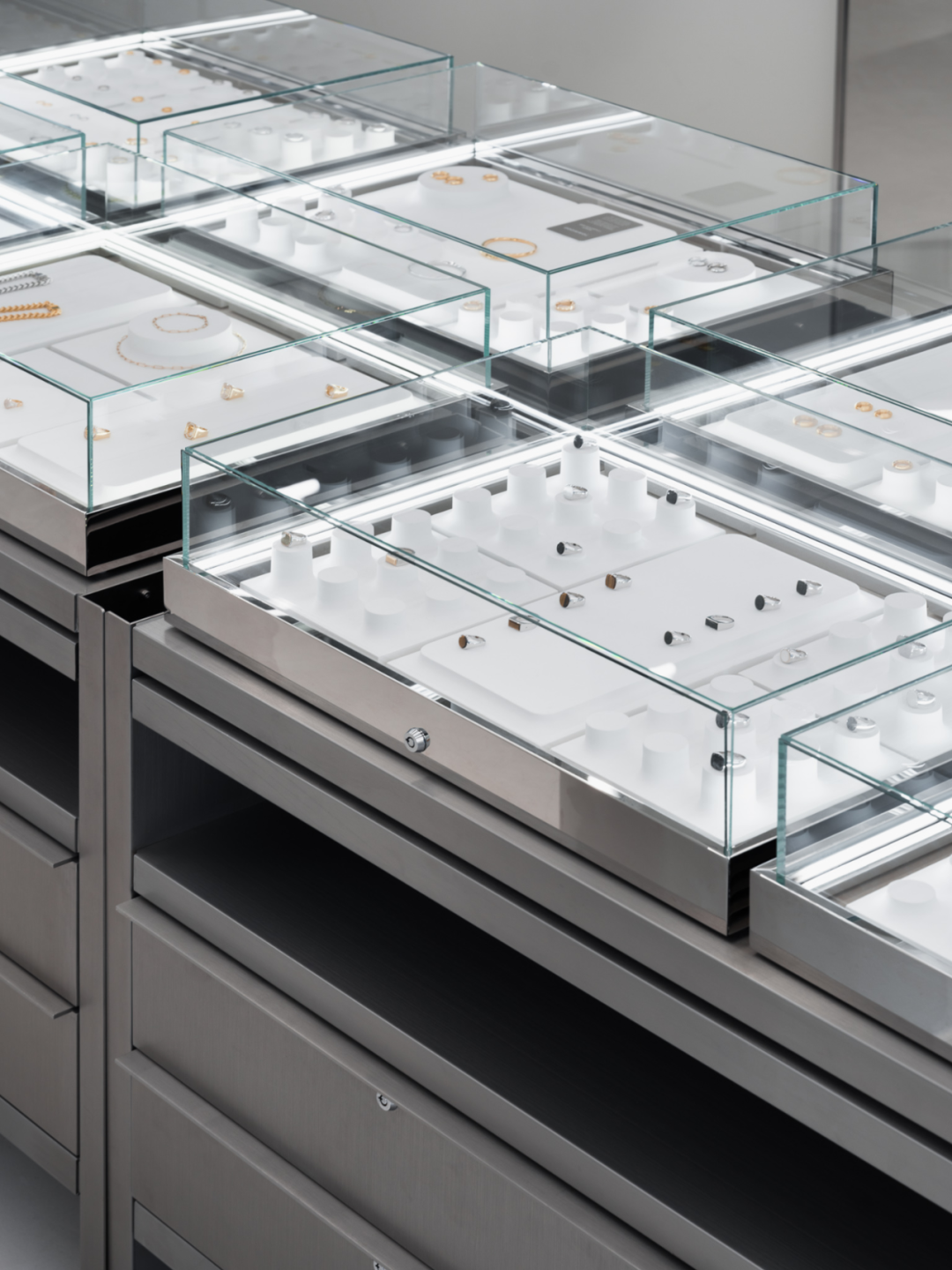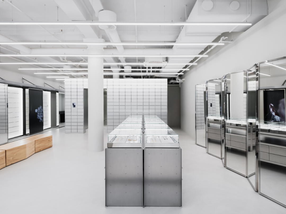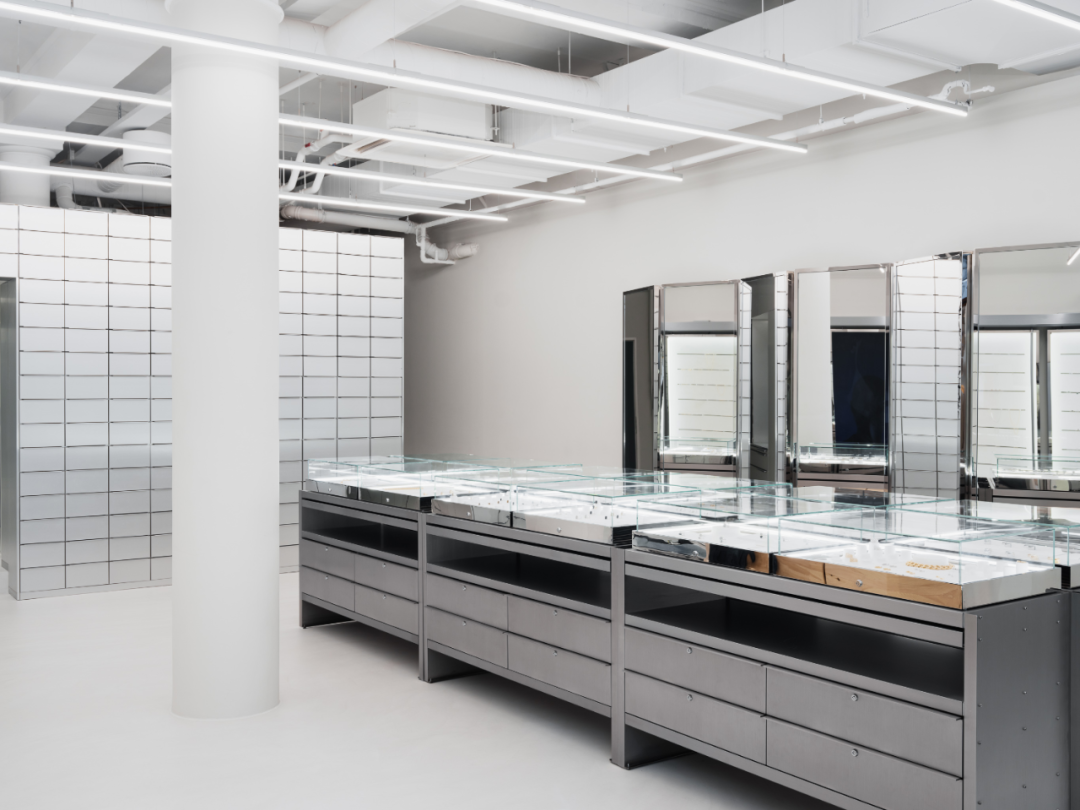 在设计过程中,环境价值和可持续性是Tom Wood旗舰店的重要考虑因素。可回收材料如铝和钢被优先选择,这些材料未来可以轻松改造或重新利用。进入旗舰店后,顾客会被一排由钢铁制成的六个橱柜所吸引,每个橱柜都陈列着精美的珠宝。墙上的大镜子组成的锯齿形屏风为店内增添了一丝独特的艺术氛围,而地板到天花板的架子单元则展示了各种各样的小抽屉,引人注目。