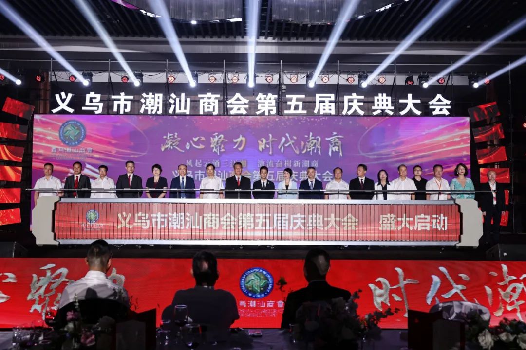 8月28日,义乌市潮汕商会举办了第五届理事会就职仪式。潮南籍的80后青年企业家—浙江跃嘉纺织科技有限公司董事长钟楚龙接任义乌市潮汕商会第五届理事会会长。郑晓洁代表潮南区上台推动启动杆并为商会高层颁牌。