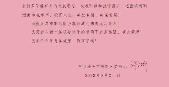 郑晓洁通报潮南区经济社会发展情况和营商环境的喜人变化,表示今年3月,区政府主要领导带队赴义乌市招商引资,义乌市潮汕商会考察团第一时间组织数十家企业带着“需求清单”回乡投资,第一期计划落地的企业11家共12个项目,商会与潮南的深度合作恰逢其时,为潮南高质量发展注入了强劲动力。热忱期盼各位乡亲常回家看看,感受家乡的新面貌新变化,一如既往地支持家乡建设,为家乡招商引资、实体经济发展牵线搭桥、宣传推介,为家乡高质量发展献计献策、添砖加瓦,携手培育更多优质项目,共同建设现代化和美富裕新潮南!