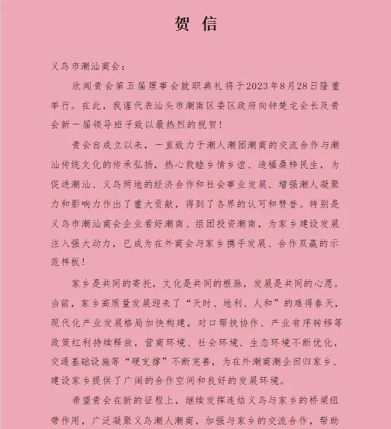 就职仪式前,郑晓洁一行与义乌市潮汕商会召开乡亲恳谈会。钟楚龙会长对郑晓洁一行表示热烈欢迎,衷心感谢潮南区委、区政府一直以来的关心和支持,特别是高度重视招商引资工作,为在外乡贤们返乡投资创业提供良好的投资环境、优质的高效服务,让我们真切的感受到家乡的真情厚意。目前商会现有会员1068名,分布在各行各业。接下来希望通过纺织服装、精细化工、精品文具等产业,整合优势资源,实现与潮南产业的精准对接,以此来加强商会凝聚力,提高商会的社会影响力,努力建设“让党和政府放心、会员单位满意、人民群众称赞”的服务型商会。座谈会上,郑晓洁宣读区委书记许广圻给义乌市潮汕商会第五届理事会就职仪式的贺信,预祝就职仪式取得圆满成功,祝福商会会务昌隆、事业繁荣。