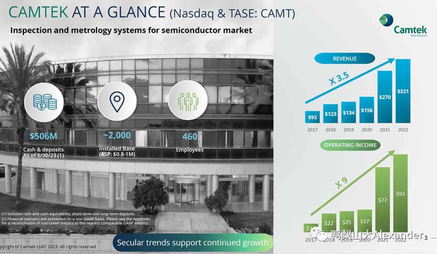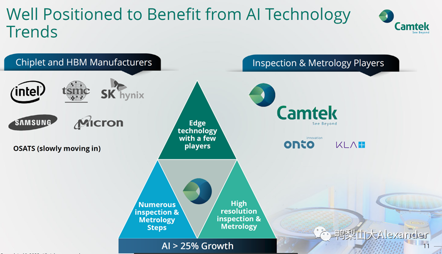 CAMT是先进封装量测的核心企业,先进封装量测细分领域全球龙头(CAMT和onto双寡头),下游全为全球头部客户,HBM就三家(海力士,三星,美光),再加上英特尔和台积电。其他的一些封测厂正在逐步进入中。