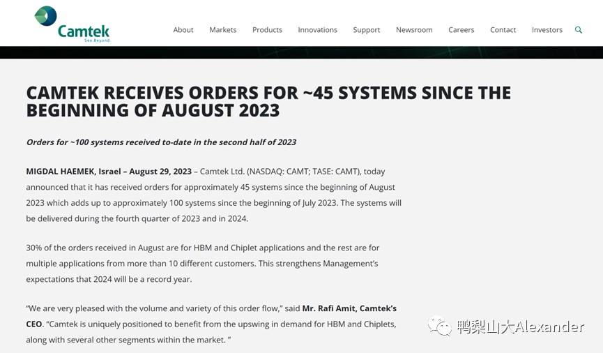 自2023年8月初以来,Camtek收到了约45套系统的订单,到目前为止,2023年下半年已收到约100套系统的订单。2023年8月29日- Camtek Ltd.(纳斯达克股票代码:CAMT;TASE: CAMT)今天宣布,自2023年8月初以来,该公司已收到约45套系统的订单,自2023年7月初以来,该公司已收到约100套系统的订单。这些系统将在2023年第四季度和2024年交付。8月份收到的订单中有30%是HBM和Chiplet应用程序,其余订单来自10多个不同客户的多个应用程序。这加强了管理层对2024年将是创纪录的一年的预期。Camtek的首席执行官Rafi Amit先生说:“我们对订单的数量和种类感到非常满意。Camtek具有独特的优势,可以从HBM和Chiplets以及其他几个细分市场的需求增长中受益。”
