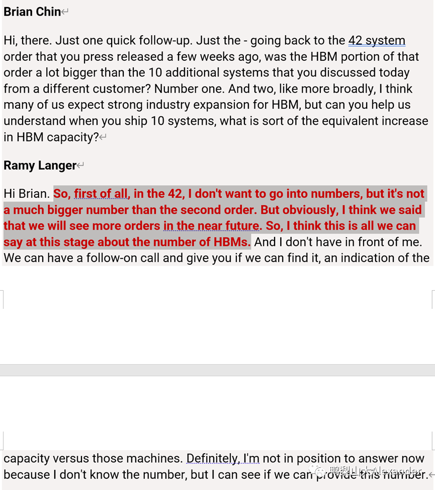 5. 三星和海力士是大客户。平均单台机器90万-100万美金。因此7月份以来的100套系统,就是1亿美金订单。