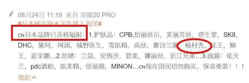 植村秀是日本知名化妆品品牌,在日本将核污水排海后,有网友整理出一份《日本品牌已含核辐射》的化妆品品牌名单,植村秀便在其中。