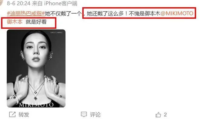 迪丽热巴的宣传照片也是有目共睹,在她的代言下,御木本逐渐在国内站住脚。粉丝也对该品牌赞不绝口,称:“御木本就是好看”。