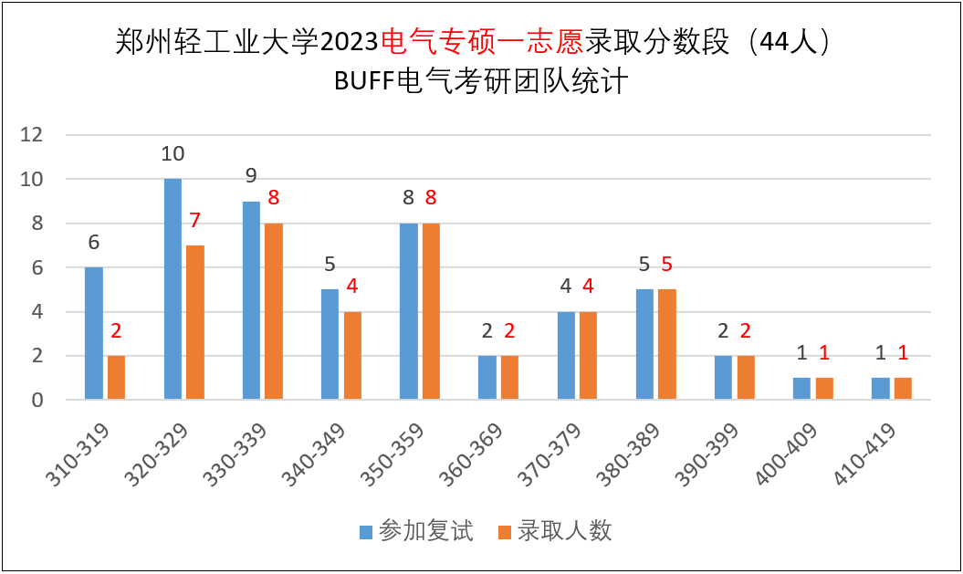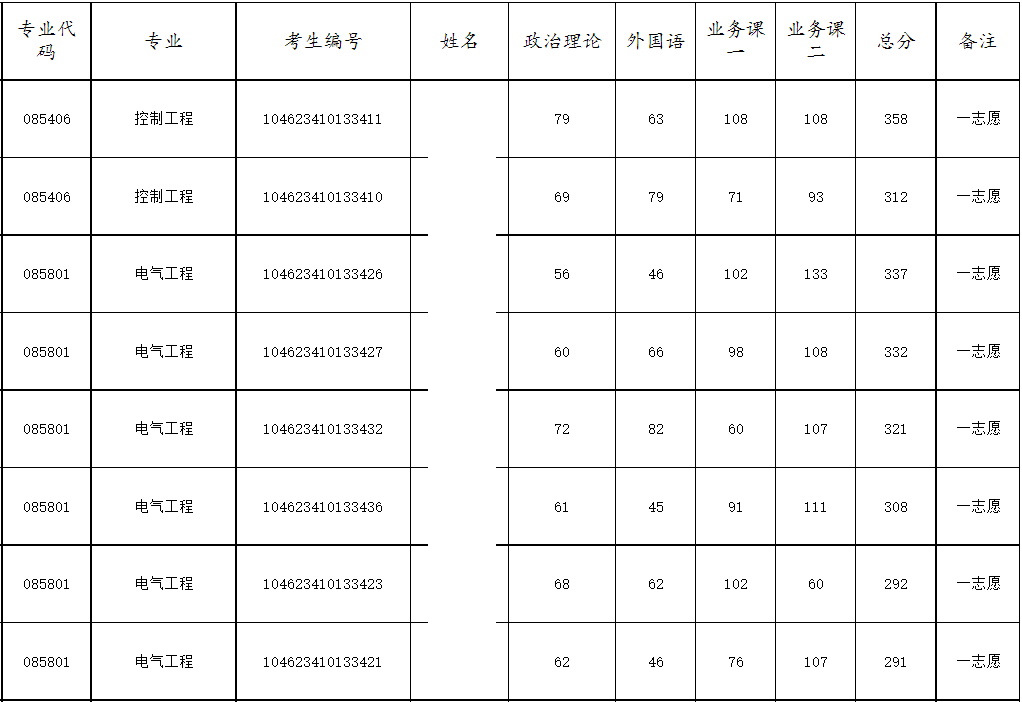 一志愿普通考生有53人进入复试,录取44人,录取初试平均分353分,最低分312分,最高分411分。一志愿进复试的53人,电路平均分118.5分,最高分146分,最低分84分。此外,士兵计划3人进入复试,录取1人,初试302分。