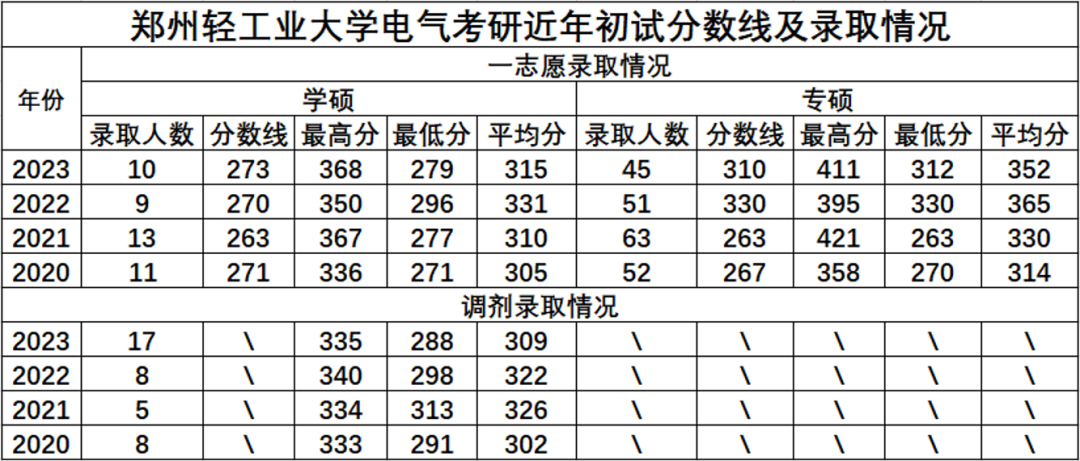 电气信息工程学院2020-2023年录取统计如下。电气学硕23有扩招,一志愿过国家线基本全部录取,且有不少调剂名额;电气专硕有缩招,分数线在22大幅上涨后有所下降,录取平均分350+。