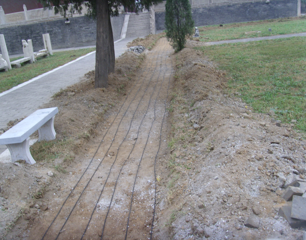 砾石:当在砾石地面铺设传感光纤时,同样采用平行铺设多道传感光缆的铺设方式。通常平行铺设传感光缆的间隔为25至30cm,埋设深度为5至15cm,如图所示。在施工时,沿周界区域首先挖一道在需要铺设光缆的区域挖出一道宽1。2m,深18cm的凹槽,在凹槽的底部平铺一层厚度为3cm的砾石,再将传感光缆平行铺设于砾石表面,每隔50cm用钢丝线卡子固定(线卡子可避开砾石固定到底层的泥土上)。光缆铺设完成后,在其上面覆盖一层厚度为15cm的砾石。使用的砾石必须没有尖锐的边缘,这样可以避免砾石受到挤压时对传感光纤造成损害.
