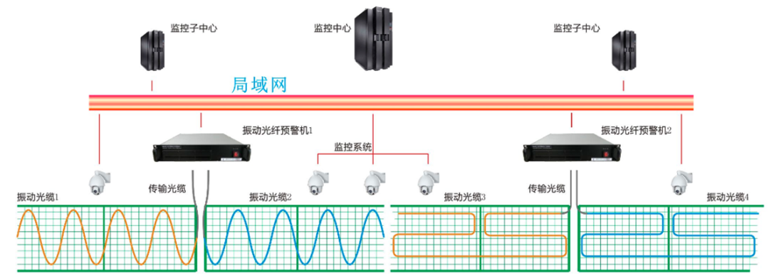振动光纤在周界报警系统中属于高端报警系统,其不同于红外对射的遮断光束报警,也不同于脉冲电子围栏的触碰合金线产生报警,其工作原理是激光器发出直流单色光波,光信号通过光缆经过光学模块使光信号产生两道干涉信号,信号利用光纤作为振动传感载体,实现防护预警探测,当有人非法入侵,光波信号的强度高出预定指标,从而产生报警信号。
