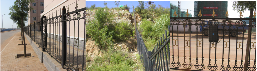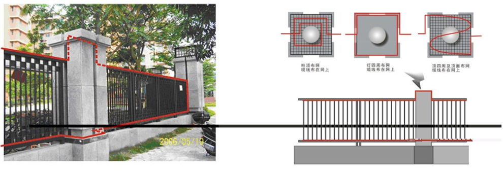 在铁艺围栏中,有的铁艺会安装在柱子,如果支柱的面积不大,铺设光缆时可直接越过柱子,如上图。但有些支柱的横截面比较大,容易被入侵者利用这个区域进入,所以对这样的区域必须加以保护。可在支柱顶部安装铁网,铺设光缆时,将传感光缆铺设到该铁网上,如图所示。
