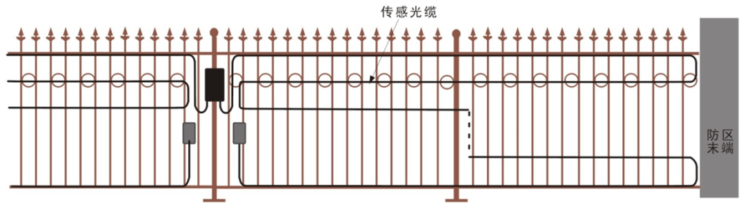 如需提高警戒级别,可在铁艺围栏的中间部分铺设一道或多道传感光缆,如图所示.