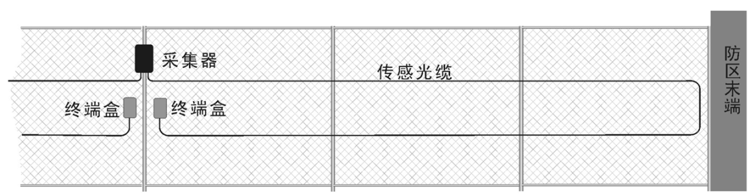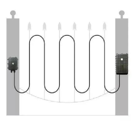 这种铺设方式可探测到攀爬、翻越、剪网、梯子辅助翻越等入侵方式。通过采用水平铺设多道光缆的方式,可增大围栏的感应面积,从而有效地探测到较弱的入侵信号,如图所示。该方式适用于警戒级别较高的场所.传感光缆沿围栏顶部铺设,到达防区末端时绕过来按相反方向直线铺设.可按需求来回多铺几道,光缆铺设的间隔可按铁网高度平均分布。