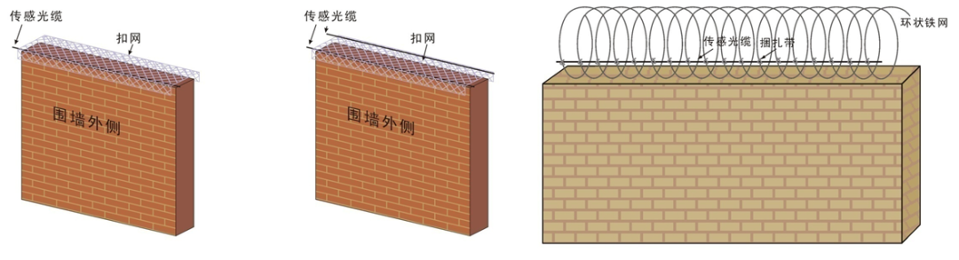 如果入侵者采用翻越的方式进入,则此过程中产生的振动极其微弱,传感光缆感应到的信号不足以作为判断入侵的依据,所以防范这种入侵方式时,必须在墙头上安装扣网,滚网或立网,以增加振动的强度和感应面积.扣网材料一般采用Φ3、孔径为20cm
