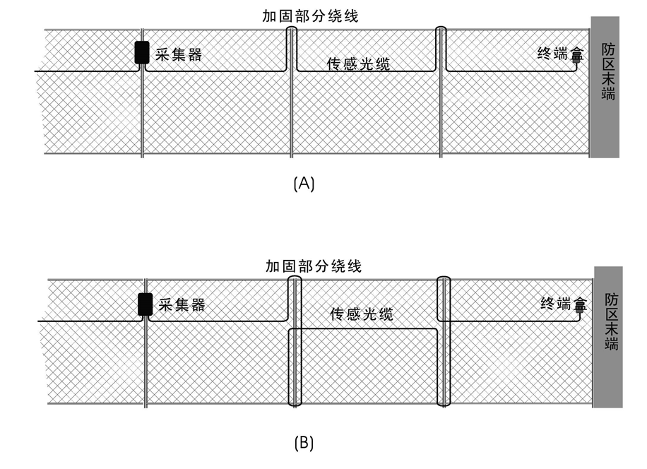 传感光缆的灵敏度在整个防区范围具有一致性,但介质的松紧度是会有变化的,所以在铺设传感光缆时要考虑这一因素的影响,在较紧的介质上铺设的光缆感应面积要比在较松的介质上铺设的光缆的感应面积大,例如在铁网的立柱部分、防区末端部分铺设光缆时,可按图示方式进行铺设,如图所示,其中图(B)的铺设方式比图(A)的方式更敏感.是否需要使用这种方式来增加加固部分防区的灵敏度,应通过现场测试来确定.
