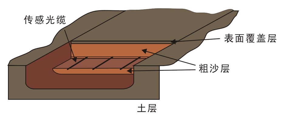 沙土地:在沙土地下埋设传感光缆时,也采用平行铺设多道传感光缆的方式,由于沙土比较松软,当入侵者进入该区域时,透过沙土层对传感光缆施加压力,传感光缆可探测到微小的挤压变形并产生信号,所以在沙土地埋设传感光缆时,应减小平行传感光缆的间距,而且埋设不可过深。通常间隔为20至25cm,埋设深度为5至12cm,如图所示。在进行施工时,首先在需要铺设传感光缆的区域挖出一道宽1。2m,深15cm的凹槽,在凹槽的底部平铺一层厚度为3cm的粗沙,再将传感光缆平行铺设于粗沙表面,每隔50cm用钢丝线卡子固定。传感光缆铺设完成后,在其上面覆盖一层厚度为10cm的粗沙,最后在其表面均匀地覆盖一层1cm的地表介质(细沙或松散干燥的泥土)。