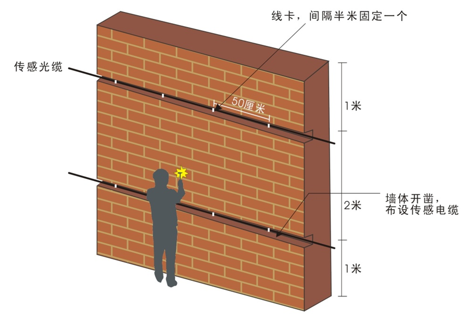 凿墙是一种常见的针对围墙的入侵方式,传感光缆可以采集到入侵者凿墙时产生的微小振动。施工人员可采用平行线型方式在墙面上铺设两道光缆,围墙的高度不应超过2米,光缆应固定在距离地面0.5米和1。5米处,如果围墙高度大于2米,则高度每增加1米,需增加一道光缆,光缆水平固定在该区域的中部。为了保证传感光缆能感应到凿墙时产生的振动,必须保证墙面结实,砖块不能有松动,并且光缆应紧密地附着在围墙表面。可使用线卡子每隔50厘米进行固定。如图所示