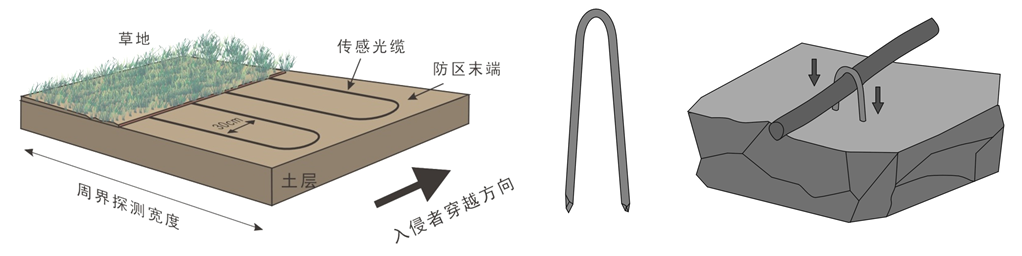 草地:在草坪下埋设传感光缆时,如果该区域已经铺上草坪,应先将需要铺设传感光缆的周界区域的草坪用草坪切割机铲起。周界区域宽度应不小于1。2米,如需提高警戒级别,可增加周界区域的宽度.在土层的表面沿周界方向迂回平行铺设多道传感光缆,光缆间隔距离为30cm,即1.2米宽的区域应平行铺设5道传感光缆,如图所示。传感光缆应平直、紧密地附着在土层表面,可采用Φ5的钢丝折弯成,如图所示的线卡子,每隔50cm用线卡子将传感光缆紧压在土层上,但应注意避免因压力过大造成光缆变形。固定好光缆后,将草坪平铺在上面,应保证草坪接合处紧密,以避免传感光缆外露.