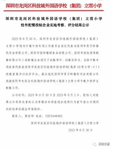 立雪小学校外配餐投标企业实地考察、评分结果公示