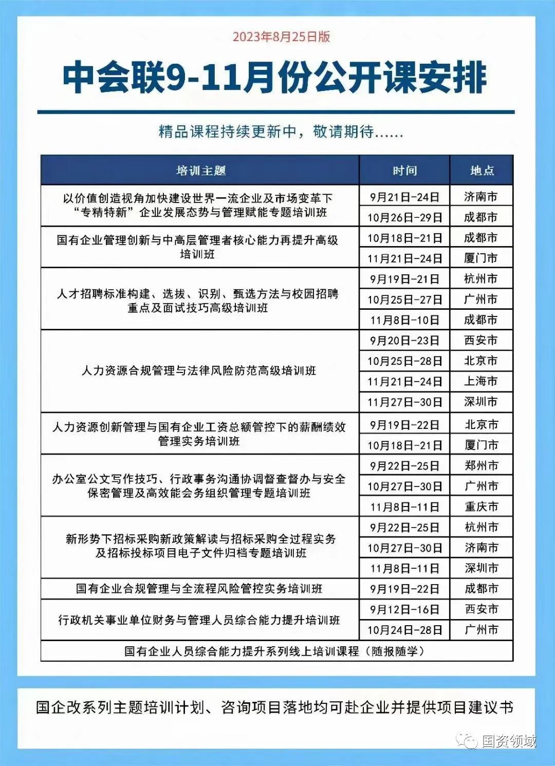 为帮助招标采购从业人员及时了解招标采购最新政策法规,解决在招标采购全过程中的问题,中国投资协会培训中心与北京中会联信息咨询中心定于9月、10月和11月分别在杭州市、济南市和深圳市举办“新形势下招标采购新政策解读与招标采购全过程实务及招标投标项目电子文件归档”培训班,希望各单位积极组织相关人员参加,相关事官涌知如下: