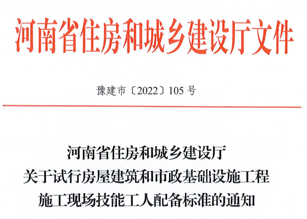 5月12日,河南省住建厅发布《关于试行房屋建筑和市政基础设施工程施工现场技能工人配备标准的通知》,从即日起致2022年12月31日在全省试行。