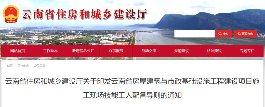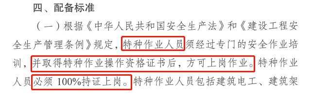 2022年6月30日,云南省住建厅发布《施工现场技能工人配备导则》,自公布之日起施行,明确:各类工程项目现场特种作业人员必须100%持证上岗。