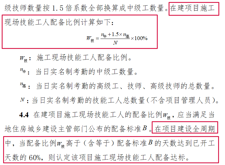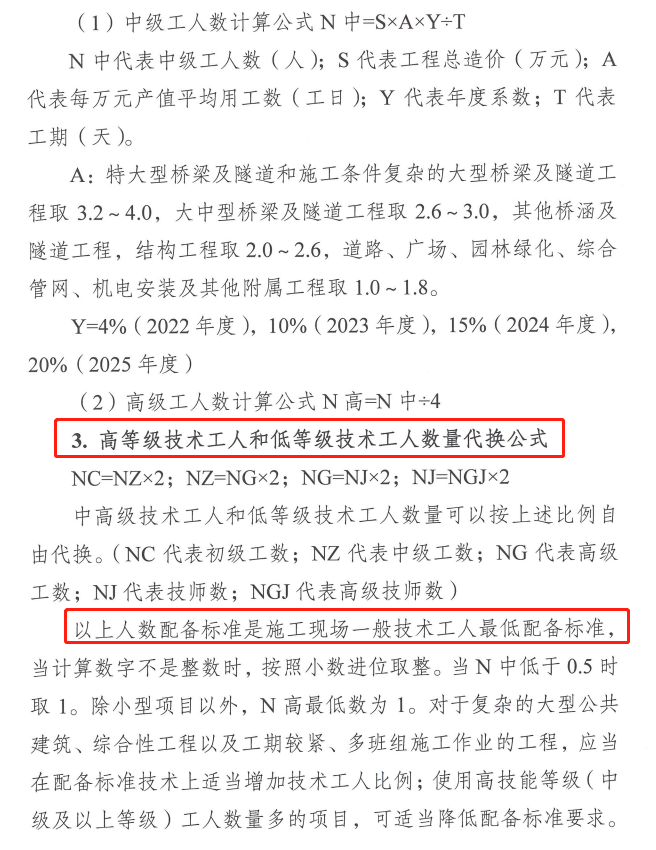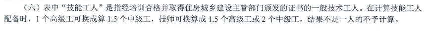 以上人数配备标准是施工现场一般技术工人最低配备标准,当计算数字不是整数时,按照小数进位取整。当N中低于0.5时取1。除小型项目以外,N高最低数为1。对于复杂的大型公共建筑、综合性工程以及工期较紧、多班组施工作业的工程,应当在配备标准技术上适当增加技术工人比例;使用高技能等级(中级及以上等级)工人数量多的项目,可适当降低配备标准要求。