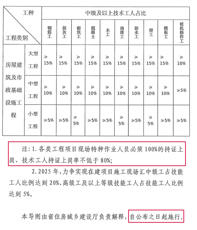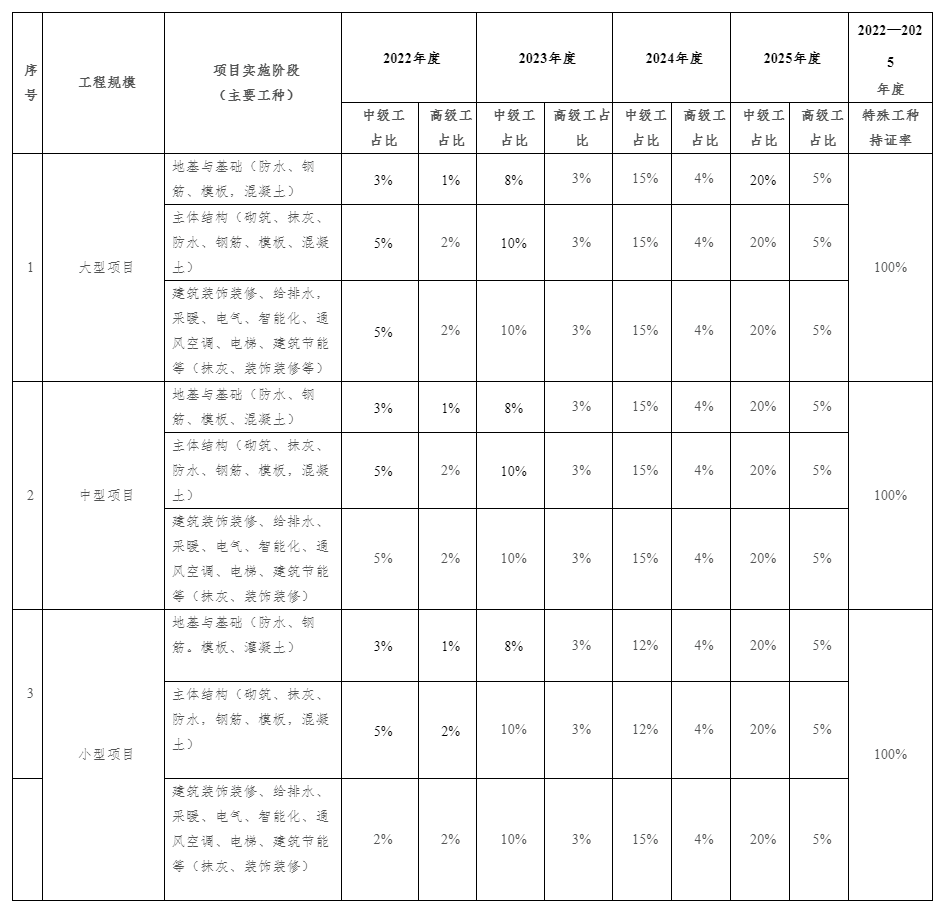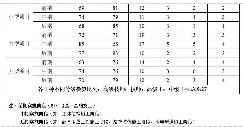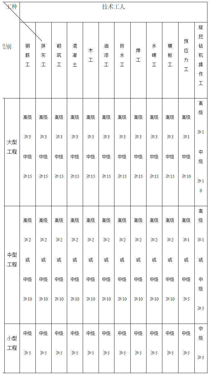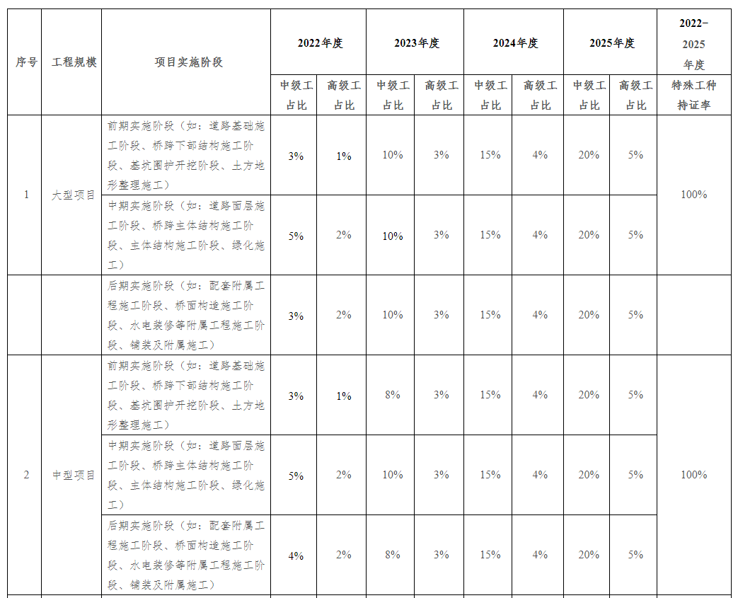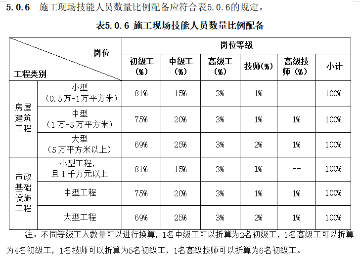 注:1.各类中、小型工程对高级工数量不做硬性要求,但各类工程项目现场特种作业人员必须100%的持证上岗,中级、初级技术工人持证上岗率不低于80%,其中中级技术工人占技术工人总数比例应不低于20%,大型工程中高级工应不低于5%。