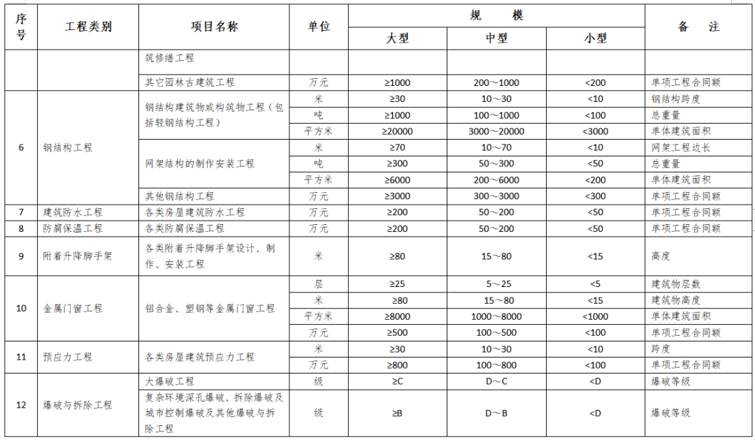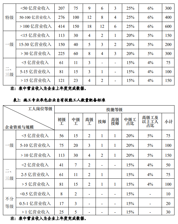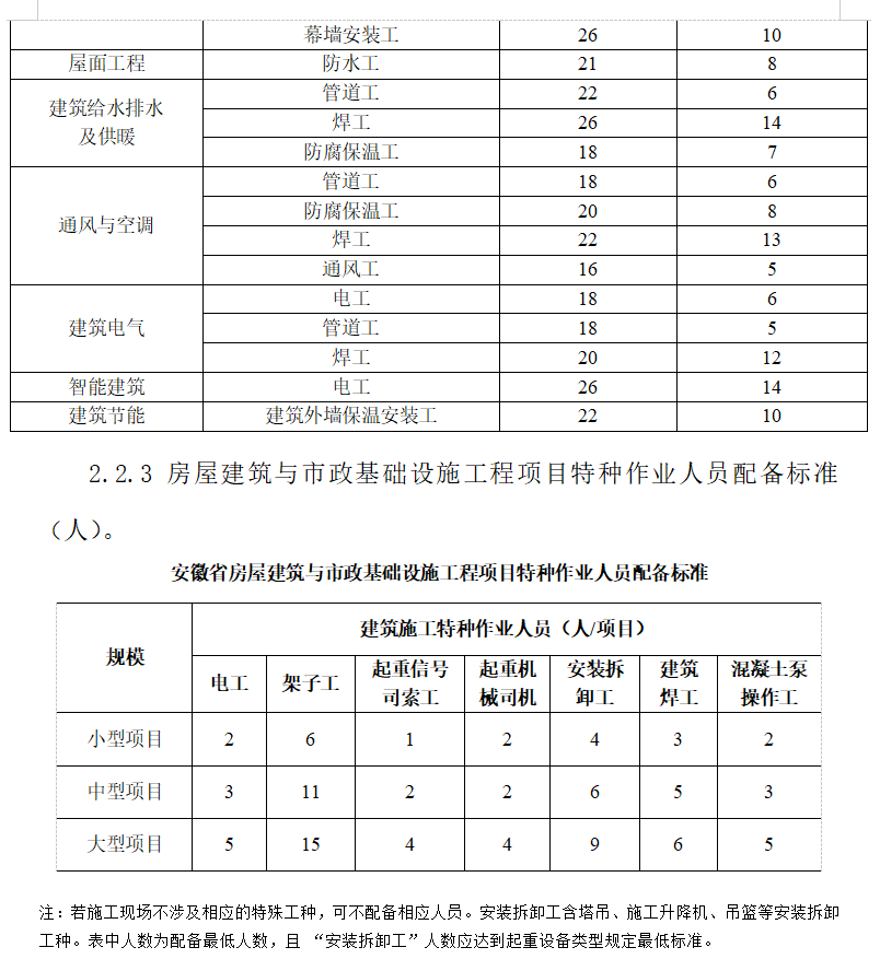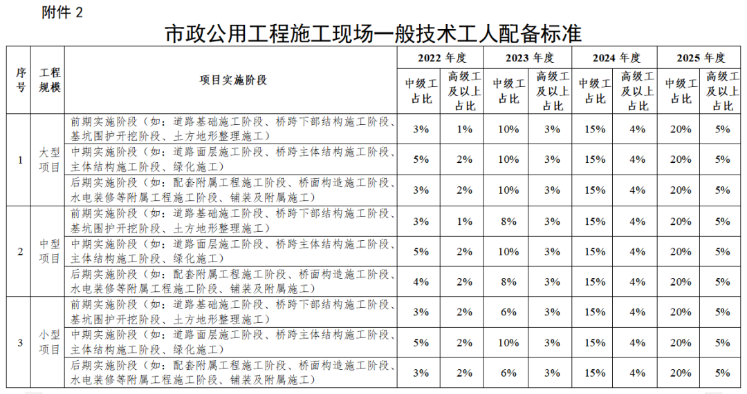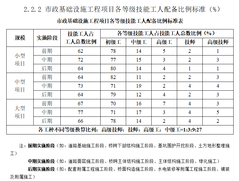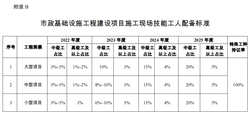 注:1.各类中、小型工程对高级工数量不做硬性要求,但各类工程项目现场特种作业人员必须100%的持证上岗,中级、初级技术工人持证上岗率不低于80%,其中中级技术工人占技术工人总数比例应不低于20%,大型工程中高级工应不低于5%。