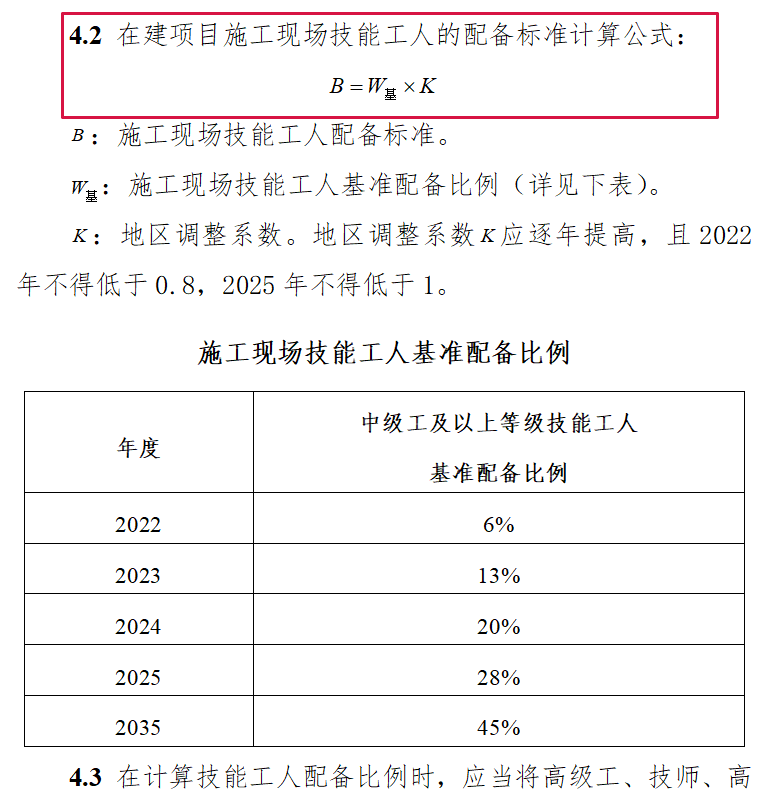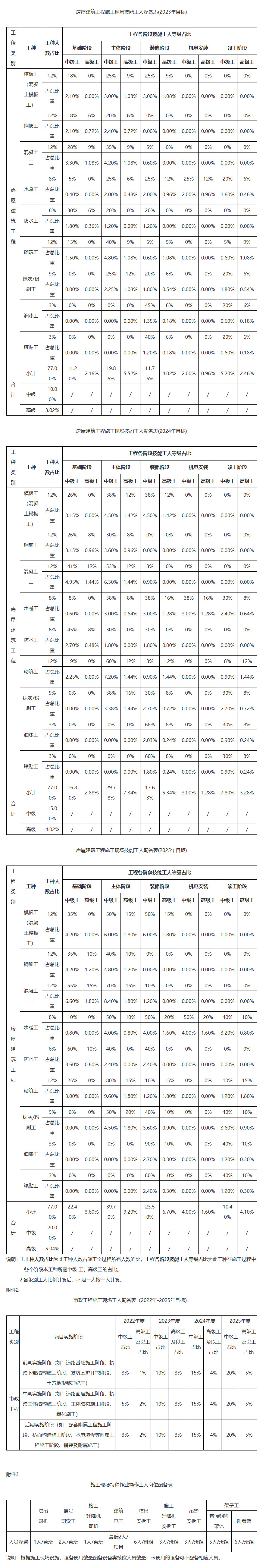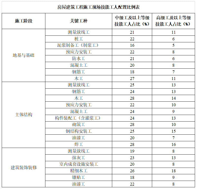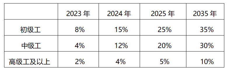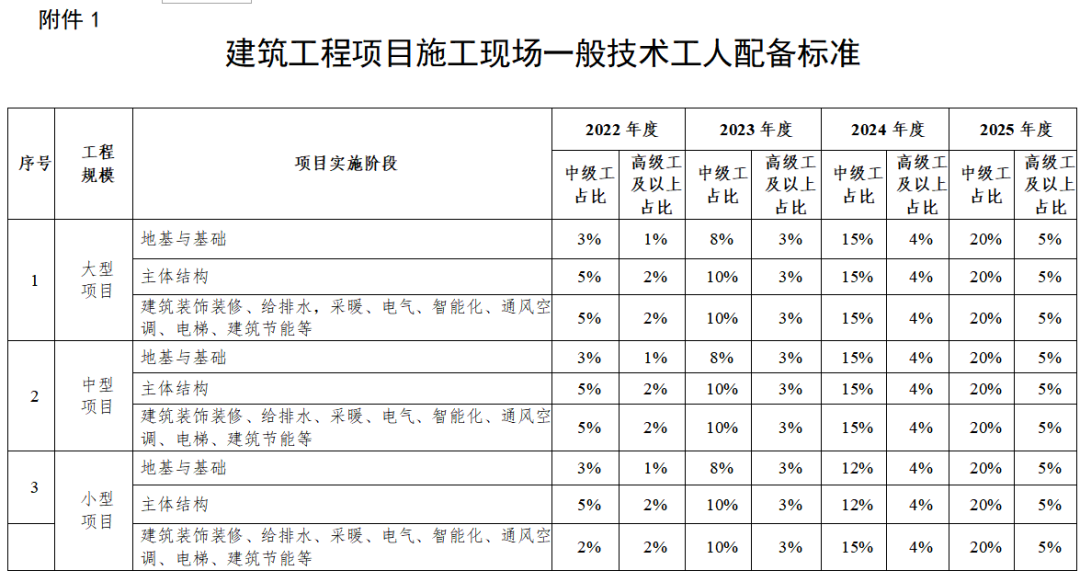 二、到2025年,施工现场技能工人中级工占比不低于20%,高级工及以上的人员占比不得低于5%。
