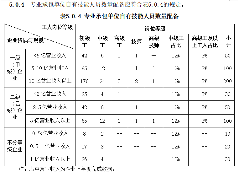 各项目技能工人配备中级、高级及以上等级技术工人不宜少于1人。