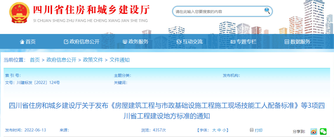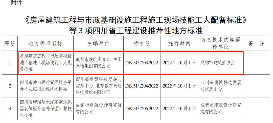 6月13日,四川省住建厅发布《房屋建筑工程与市政基础设施工程施工现场技能工人配备标准》,自10月1日起施行。
